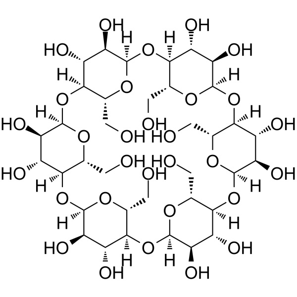 α-사이클로덱스트린(α-CD)(CAS: 10016-20-3)은 알파-1.4 결합으로 연결된 6개의 포도당 단위로 구성된 비환원 고리형 당류입니다. 이는 가수분해된 전분시럽에 대한 시클로덱스트린 글루코실 전이효소의 작용에 의해 생성됩니다. α-사이클로덱스트린의 공동은 베타-사이클로덱스트린보다 작으므로 작은 분자로 포접 복합체를 형성하는 데 사용됩니다. α-사이클로덱스트린의 물에 대한 용해도는 25℃에서 14.5g/100ml이므로 사이클로덱스트린의 높은 용해도가 필요한 상황입니다.